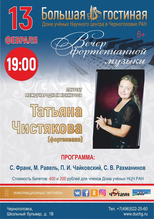 13 февраля в 19:00 приглашаем в Большую гостиную Дома ученых НЦЧ РАН на Вечер фортепианной музыки лауреата международных конкурсов Татьяны Чистяковой (фортепиано).