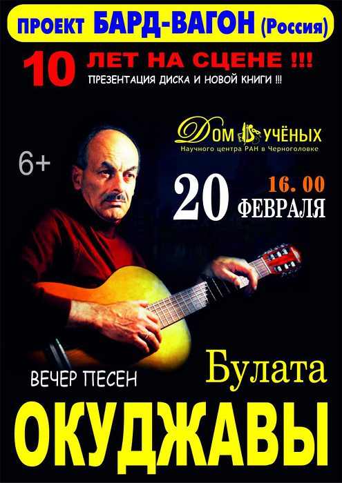 20 февраля в 16.00 в Доме Учёных г.Черноголовки состоится концерт «Вечер песен Булата Окуджавы» . Программа называется «Надежды маленький оркестрик» (к юбилею автора), а представит ее для Вас, дорогие зрители, проект «Бард-вагон»(Россия) . Несмотря на свой небольшой возраст, этот коллектив уже успел выступить с успехом в престижных концертных залах Новгородской, Владимирской, Тульской, Вологодской, Псковской, Омской, Кемеровской, Алтайской, Иркутской, Удмуртской, Ивановской, Кировской, Мурманской … филармоний, где завоевал симпатии и уважение зрителей. «Наш проект предлагает зрителям окунуться в атмосферу замечательных песен известного поэта, барда, одного из основоположников жанра авторской песни …Булата Окуджавы». В концерте прозвучит около 30(тридцати!) песен автора. Среди них: «Давайте восклицать», «Ваше благородие», «Надя-Наденька», «Песня о синих маяках», «Счастливый жребий», «Кавалергарды», «Сентиментальный марш», «Божественная суббота», «Портленд», «Здесь птицы не поют…», «Бери шинель», «По смоленской дороге», «Песня о Ночной Москве», «Дежурный по апрелю», «Любовь и разлука», «Женщина в окне», «Песня о Лёньке Королёве», «Море Черное», «Моцарт», «Грузинская песня», «Молитва»…!